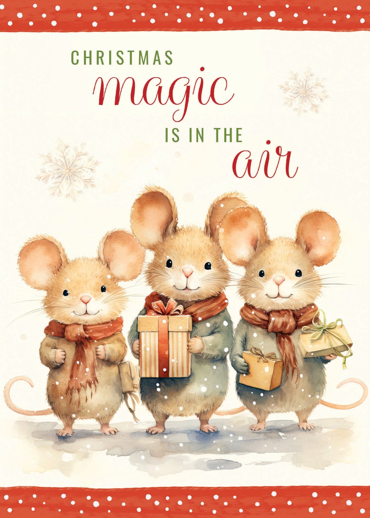 Each card measures 5″x7″ (13cmx18cm) and is printed in full colour inside and out, and comes with a coordinating colour envelope. Inside greeting:May your Christmas be wrapped in love and tied with joy!
