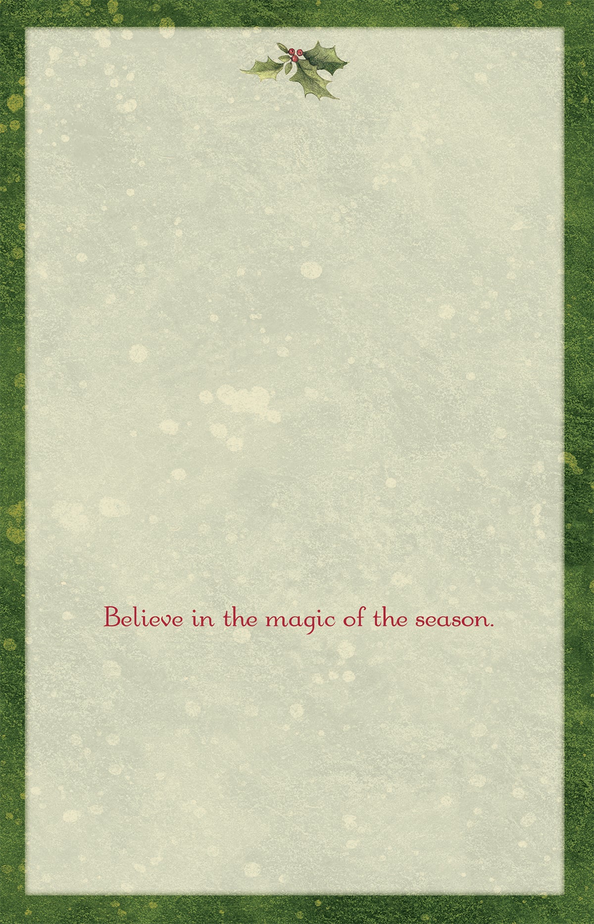 18 cards and 19 envelopes. Linen-embossed paper stock. Full-color, sturdy keepsake box. Card: 6.875″w x 5.375″h. Box: 7.75″w x 6″h x 1.5″d. Inside text: Believe in the magic of the season.