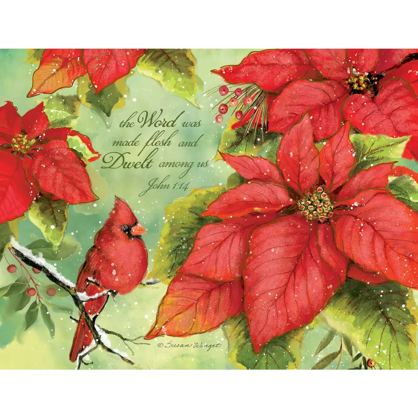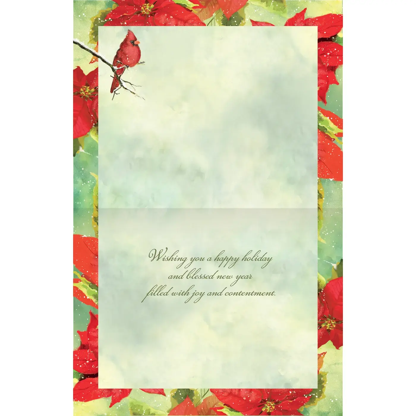 18 cards and 19 envelopes. Linen-embossed paper stock. Full-color, sturdy keepsake box. Card: 6.875″w x 5.375″h. Box: 7.75″w x 6″h x 1.5″d. Inside text: Wishing you a happy holiday and a blessed new year filled with joy and contentment.