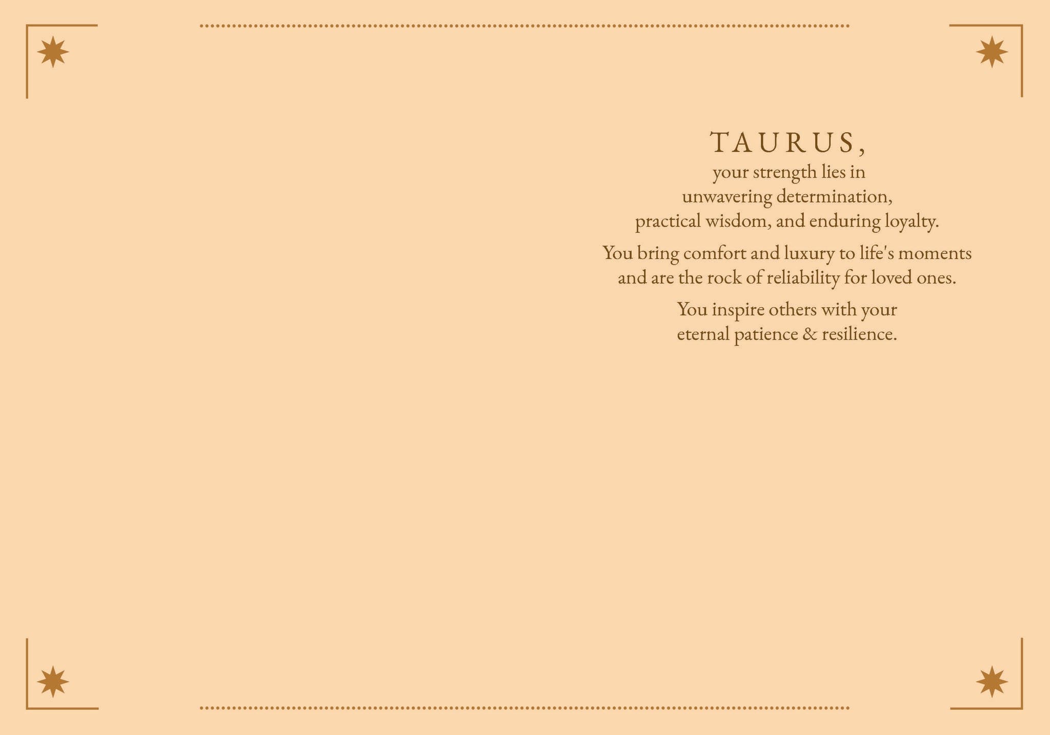 5×7. Print CAN. IN: Your strength lies in unwavering determination, wisdom, & enduring loyalty. You bring comfort & luxury to life’s moments & are the rock of reliability for loved ones. You inspire others with your eternal patience and resilience.